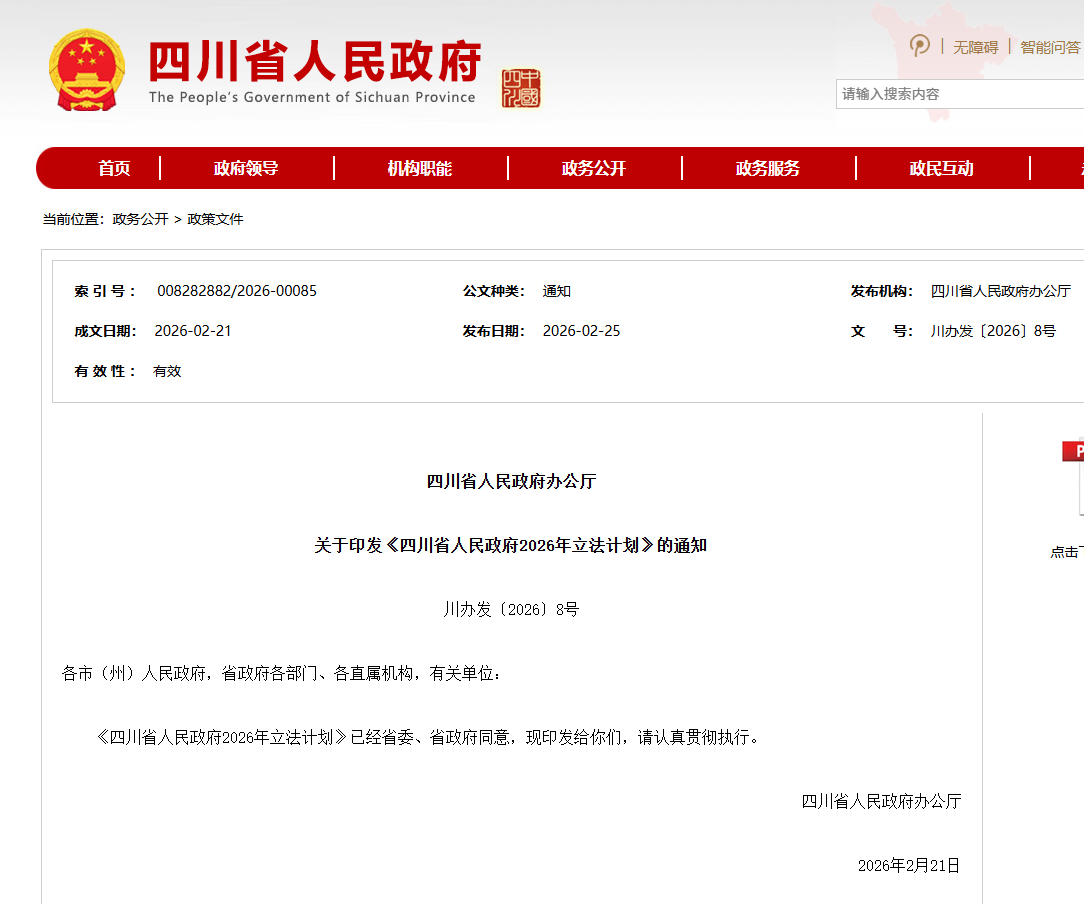 近日,四川省人民政府网站公布了《四川省人民政府2026年立法计划》。省政府2026年立法计划项目84件,其中制定类项目52件,重点调研论证类项目32件(年内条件成熟可提请审议)。